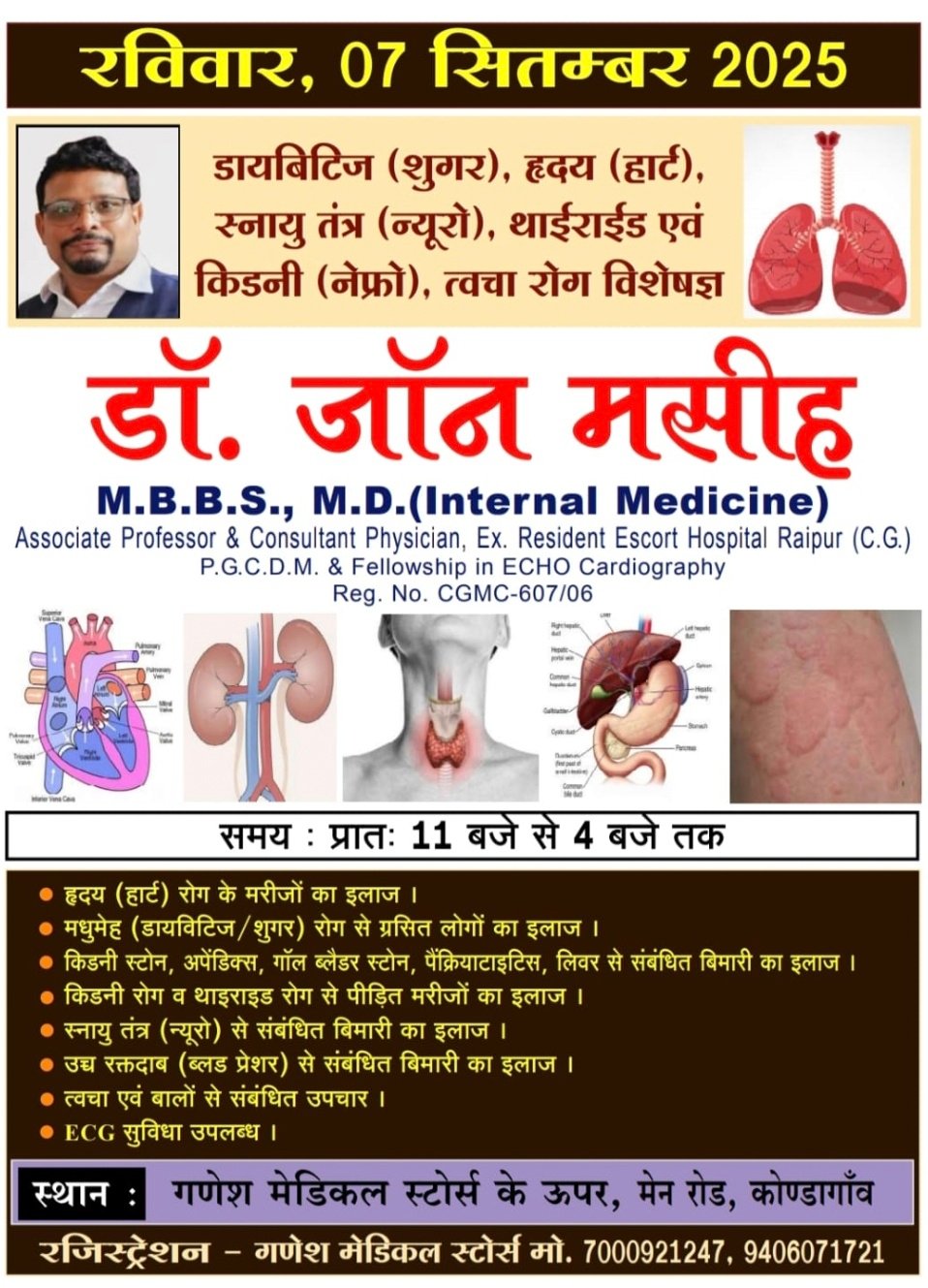 उजाला टुडे कोंडागाँव 5 सितंबर 2025- अब कोंडागाँव के निवासियों को बड़ी बीमारियों के इलाज के लिए कहीं और जाने की ज़रूरत नहीं पड़ेगी! रायपुर के जाने-माने इंटरनल मेडिसिन विशेषज्ञ डॉ. जॉन मसीह 07 सितंबर 2025, रविवार को कोंडागाँव में मरीज़ों से मिलेंगे। यह एक शानदार मौका है जब आप शुगर, ब्लड प्रेशर, थायरॉइड या दिल से जुड़ी किसी भी समस्या के लिए सीधे विशेषज्ञ से सलाह ले सकते हैं।