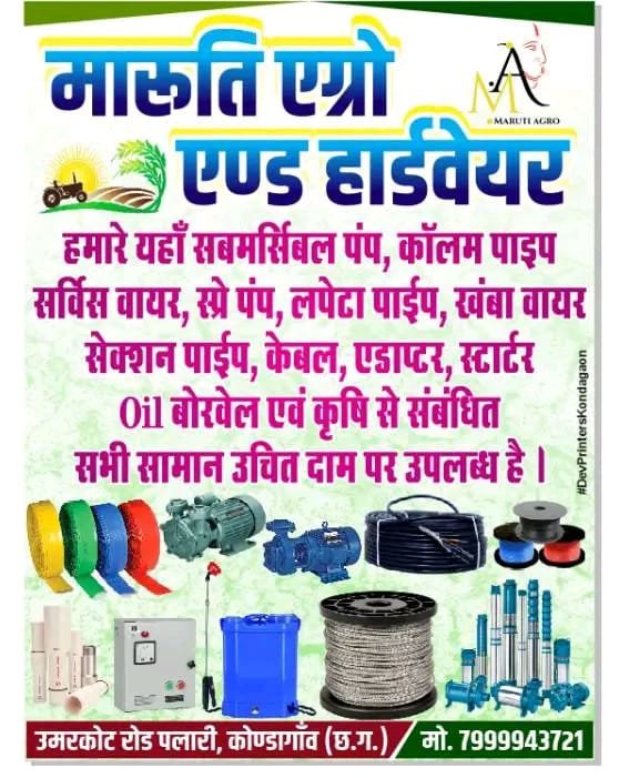 उजाला टुडे कोंडागाँव 06 सितंबर 2025- कोंडागांव उमरकोट रोड पलारी में स्थित मारुति एग्रो एंड हार्डवेयर, किसानों और आम लोगों के लिए कृषि और हार्डवेयर से संबंधित सभी जरूरतों को पूरा करने का एक प्रमुख केंद्र बन गया है। इस दुकान पर सबमर्सिबल पंप, कॉलम पाइप, सर्विस वायर, स्प्रे पंप, लपेटा पाइप, खंभा वायर, सेक्शन पाइप, केबल, एडाप्टर और स्टार्टर जैसे विभिन्न प्रकार के उत्पाद उचित दाम पर उपलब्ध हैं।