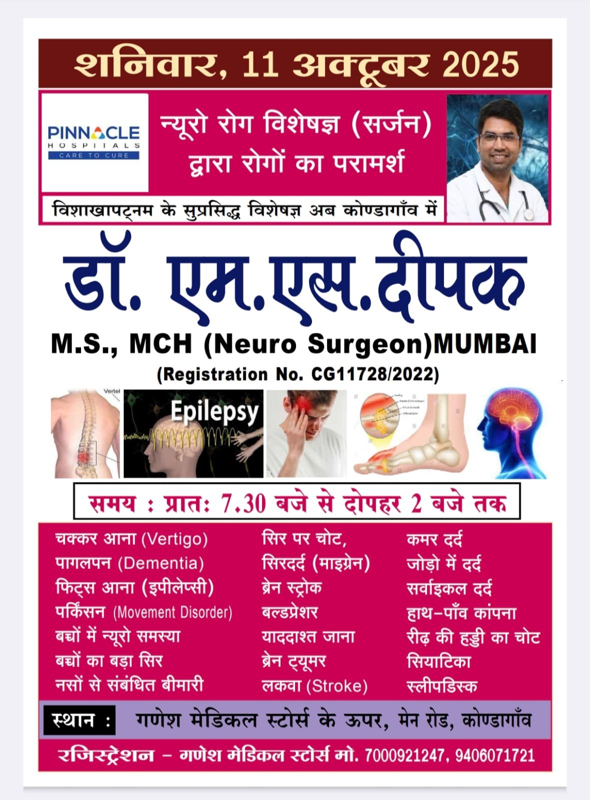 उजाला टुडे कोंडागांव 08 अक्टूबर 2025 – कोंडागांव: न्यूरो (तंत्रिका तंत्र) से संबंधित गंभीर बीमारियों के इलाज के लिए अक्सर महानगरों का रुख करने वाले कोंडागांव और आस-पास के निवासियों के लिए एक बड़ी खबर है। विशाखापट्टनम के वरिष्ठ न्यूरो सर्जन डॉ. एम. एस. दीपक एक दिवसीय विशेष परामर्श शिविर के लिए कोंडागांव आ रहे हैं।