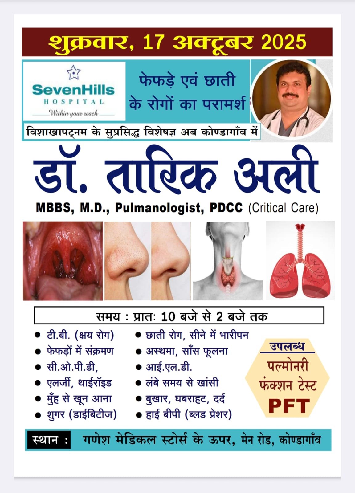 उजाला टुडे कोंडागाँव 16 अक्टूबर 2025- कोंडागाँव के निवासियों के लिए एक महत्वपूर्ण स्वास्थ्य सूचना है। विशाखापट्टनम स्थित सेवनहिल्स हॉस्पिटल के सुप्रसिद्ध विशेषज्ञ, डॉ. तारिक अली (MBBS, M.D., Pulmonologist, PDCC Critical Care), अब कोंडागाँव में फेफड़े एवं छाती के रोगों के परामर्श के लिए उपलब्ध रहेंगे।