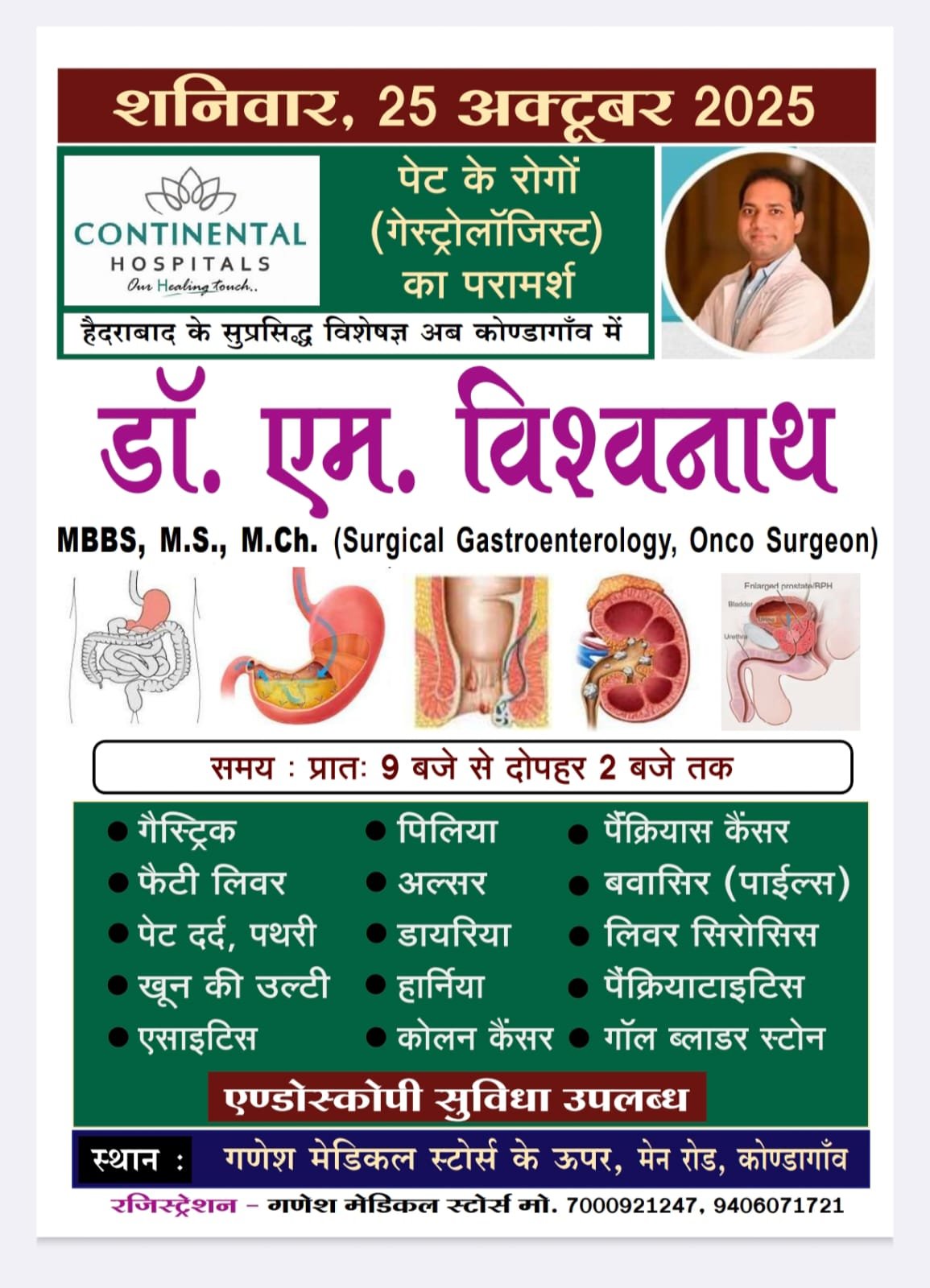 उजाला टुडे कोंडागांव 24 अक्टूबर 2025- कोण्डागाँव: पेट से जुड़ी बीमारियों से जूझ रहे कोण्डागाँव और आसपास के लोगों के लिए अच्छी खबर है। हैदराबाद के कॉन्टिनेंटल हॉस्पिटल्स के सुप्रसिद्ध विशेषज्ञ और गैस्ट्रोएंटेरोलॉजिस्ट (पेट के रोगों के विशेषज्ञ) डॉ. एम. विश्वनाथ (MBBS, M.S., M.Ch. Surgical Gastroenterology, Onco Surgeon) शनिवार, 25 अक्टूबर 2025 को कोण्डागाँव में अपनी सेवाएं देंगे।