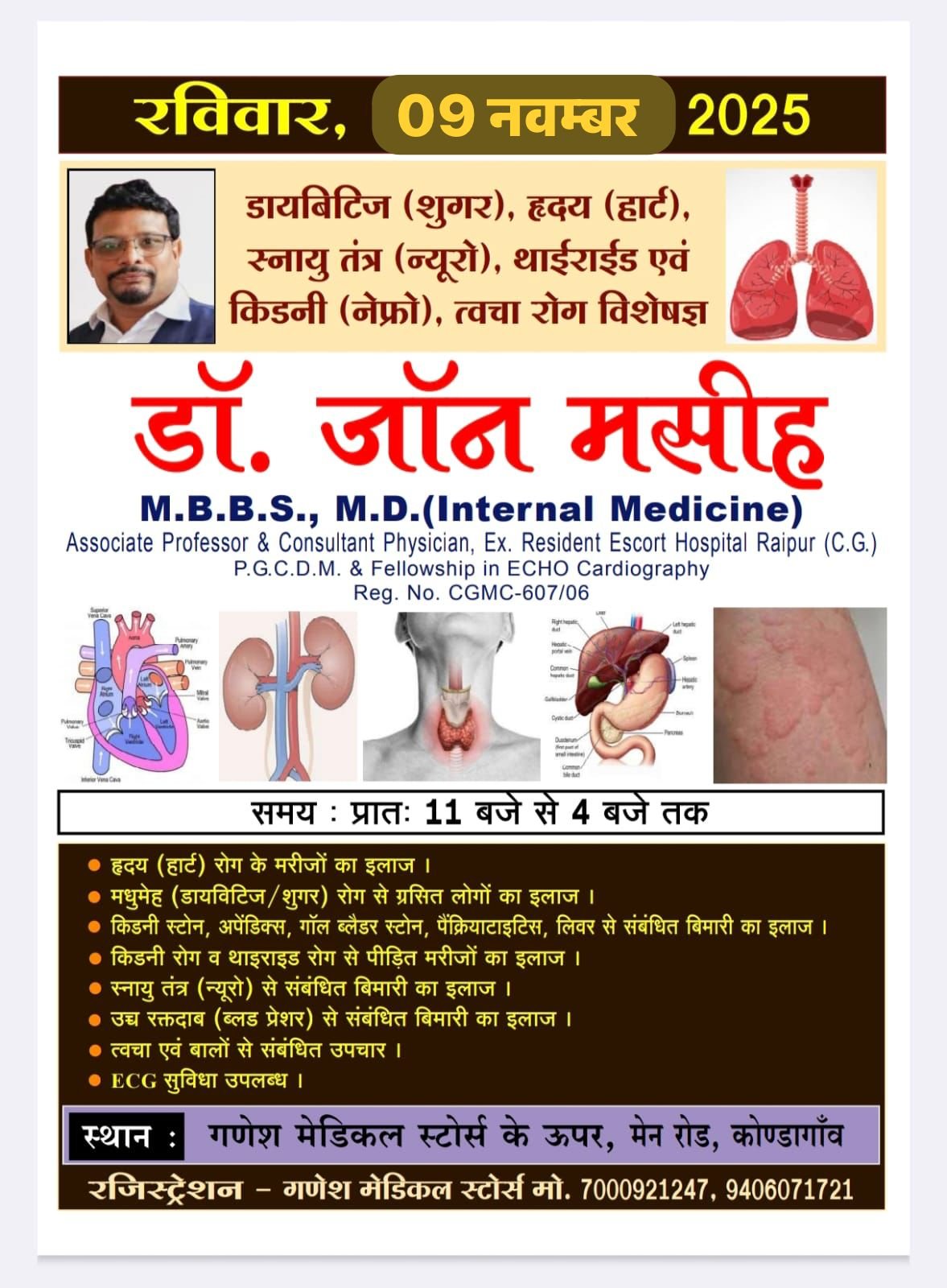 कोंडागांव में सुनहरा अवसर! रायपुर के प्रसिद्ध हृदय, डायबिटीज एवं किडनी रोग विशेषज्ञ डॉ. जॉन मसीह 9 नवंबर 2025 को उपलब्ध, ECG सुविधा भी मिलेगी