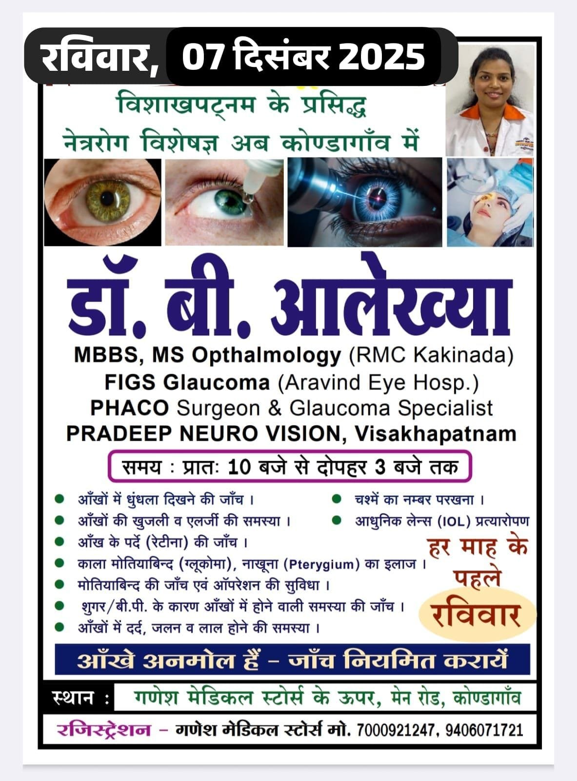 उजाला टुडे कोंडागांव 6 दिसम्बर 2025- कोण्डागाँव: विशाखापट्टनम की प्रसिद्ध नेत्र रोग विशेषज्ञ डॉ. बी. आलेख्या अब हर महीने कोण्डागाँव के लोगों को अपनी सेवाएं देंगी। यह सुविधा हर माह के पहले रविवार, प्रातः 10 बजे से दोपहर 3 बजे तक, मेन रोड स्थित गणेश मेडिकल स्टोर्स के ऊपर उपलब्ध रहेगी।