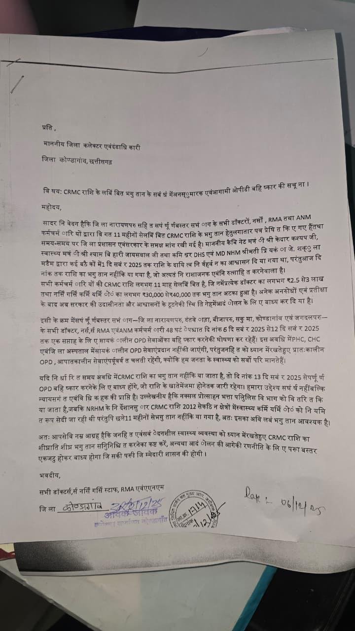 उजाला टुडे कोंडागांव 15 दिसम्बर 2025- बस्तर संभाग, छत्तीसगढ़: बस्तर संभाग के स्वास्थ्य कर्मचारियों ने आज सोमवार 15 दिसंबर 2025 को अपनी लंबित नक्सल क्षेत्र प्रोत्साहन राशि (CRMC) के भुगतान को लेकर एक बड़ा कदम उठाया, जिसके कारण ज़िला अस्पताल से लेकर प्राथमिक स्वास्थ्य केंद्र (PHC) तक की सभी OPD सेवाएँ पूरी तरह से ठप्प हो गईं।