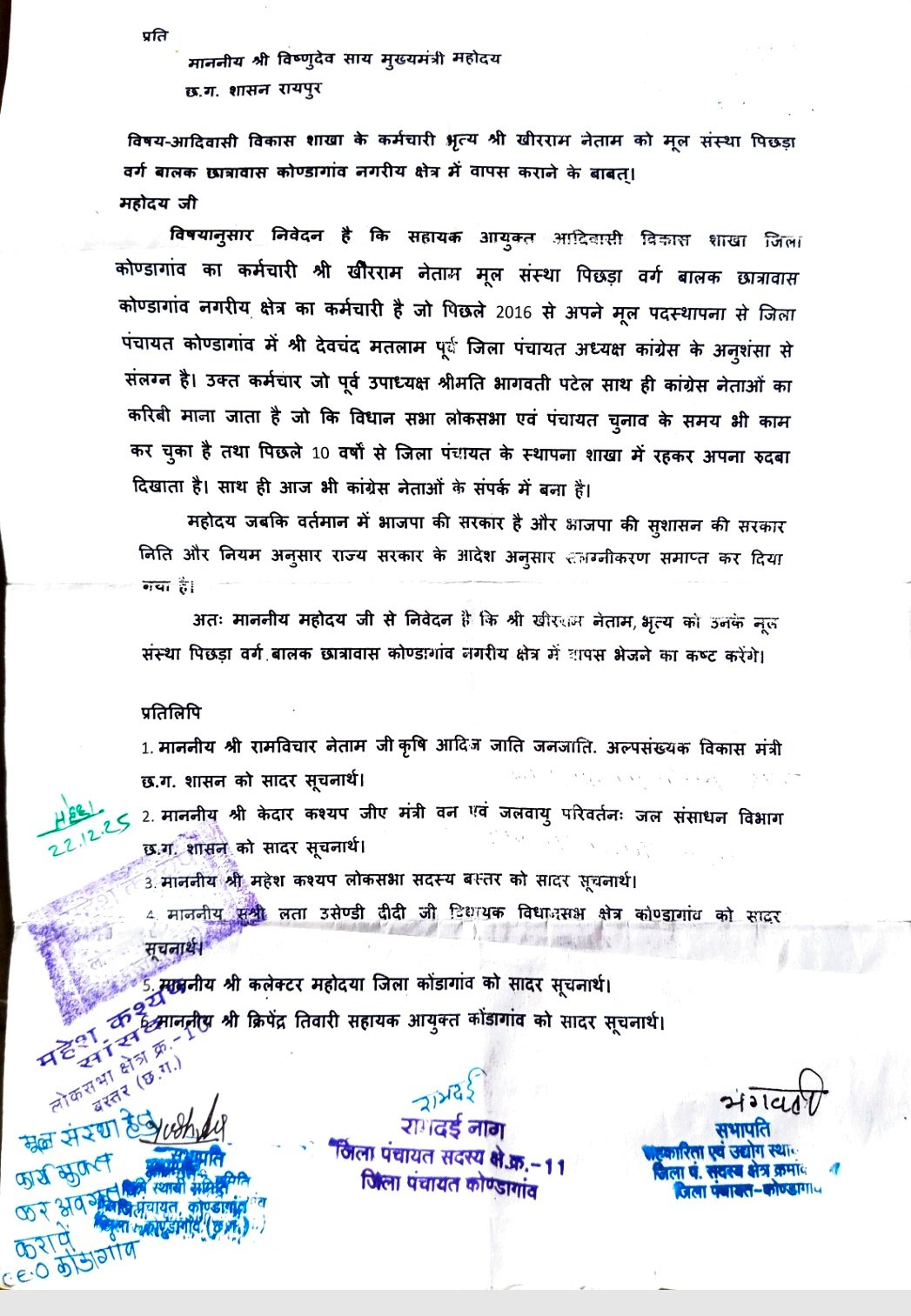 शिकायतकर्ताओं का आरोप है कि खीरराम नेताम ने सरकारी सेवक होने के बावजूद विधानसभा और लोकसभा चुनावों में कांग्रेस पार्टी का खुलकर राजनीतिक प्रचार किया। सेवा नियमों की धज्जियां उड़ाने के बाद भी उन पर कार्रवाई न होना जिला प्रशासन की कार्यशैली पर बड़ा सवालिया निशान खड़ा करता है।